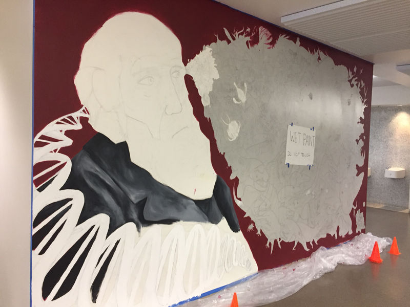 As an aspiring evolutionary biologist, when I was offered an opportunity to paint an academic-themed mural by my art teacher at my high school, I was instantly inspired. Charles Darwin revolutionized the life sciences, discovering and bringing humble appreciation to the origin and development of all life on Earth, including ourselves, the human species. Thanks to his incredible insights, now the basis of all the life sciences, we continue to learn and build upon the scientific knowledge that gives us meaning. This mural was intended to celebrate just that - Charles Darwin's theory of evolution, and the amazing discoveries that have been made since.